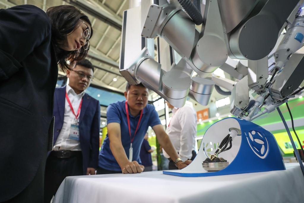 9月1日,参观者在第二十一届中国国际装备制造业博览会现场参观展出的腹腔内窥镜单孔手术系统。新华社记者 潘昱龙 摄