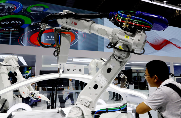 近日在上海举行的第23届中国国际工业博览会上,参观者在一组ABB机器人静态展示展品前驻足观看。新华社记者方喆 摄