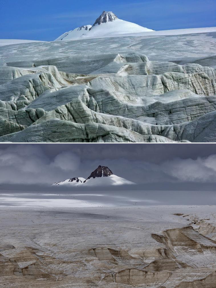 拼版照片:上图为2009年6月拍摄的普若岗日主峰(新华社发 车刚摄);下图为2024年9月4日拍摄的普若岗日主峰(新华社记者姜帆摄)。对比可以看出普若岗日主峰下的冰原消融严重。新华社发