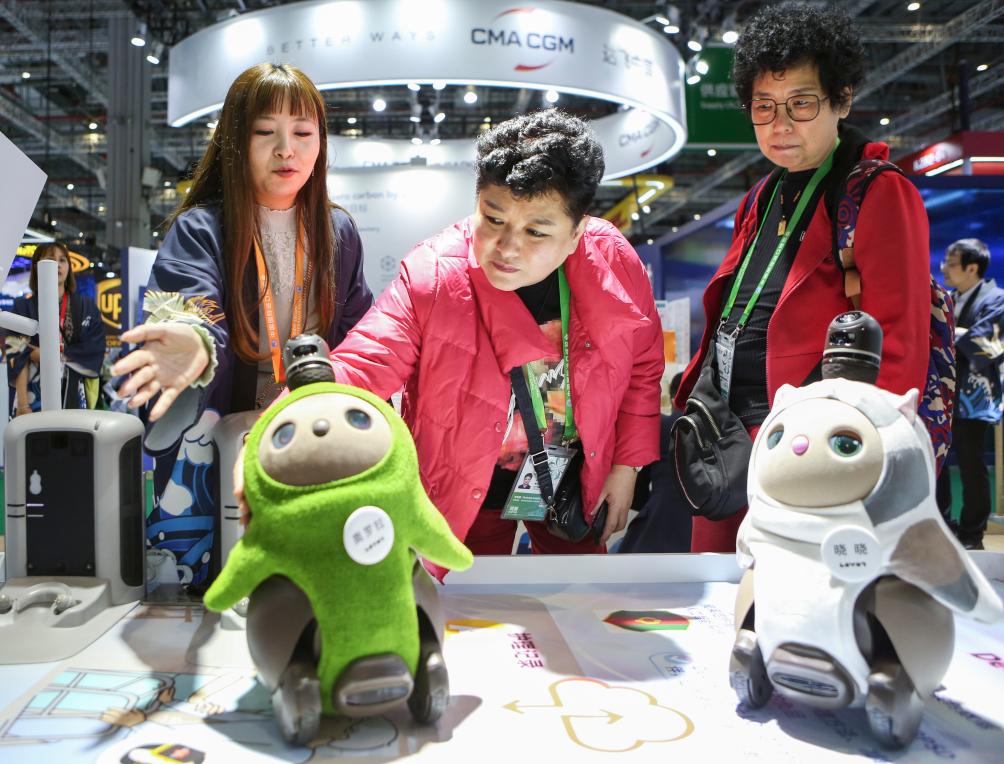 11月9日,参观者在第七届进博会上与家庭陪伴机器人互动。新华社记者 王乙杰 摄
