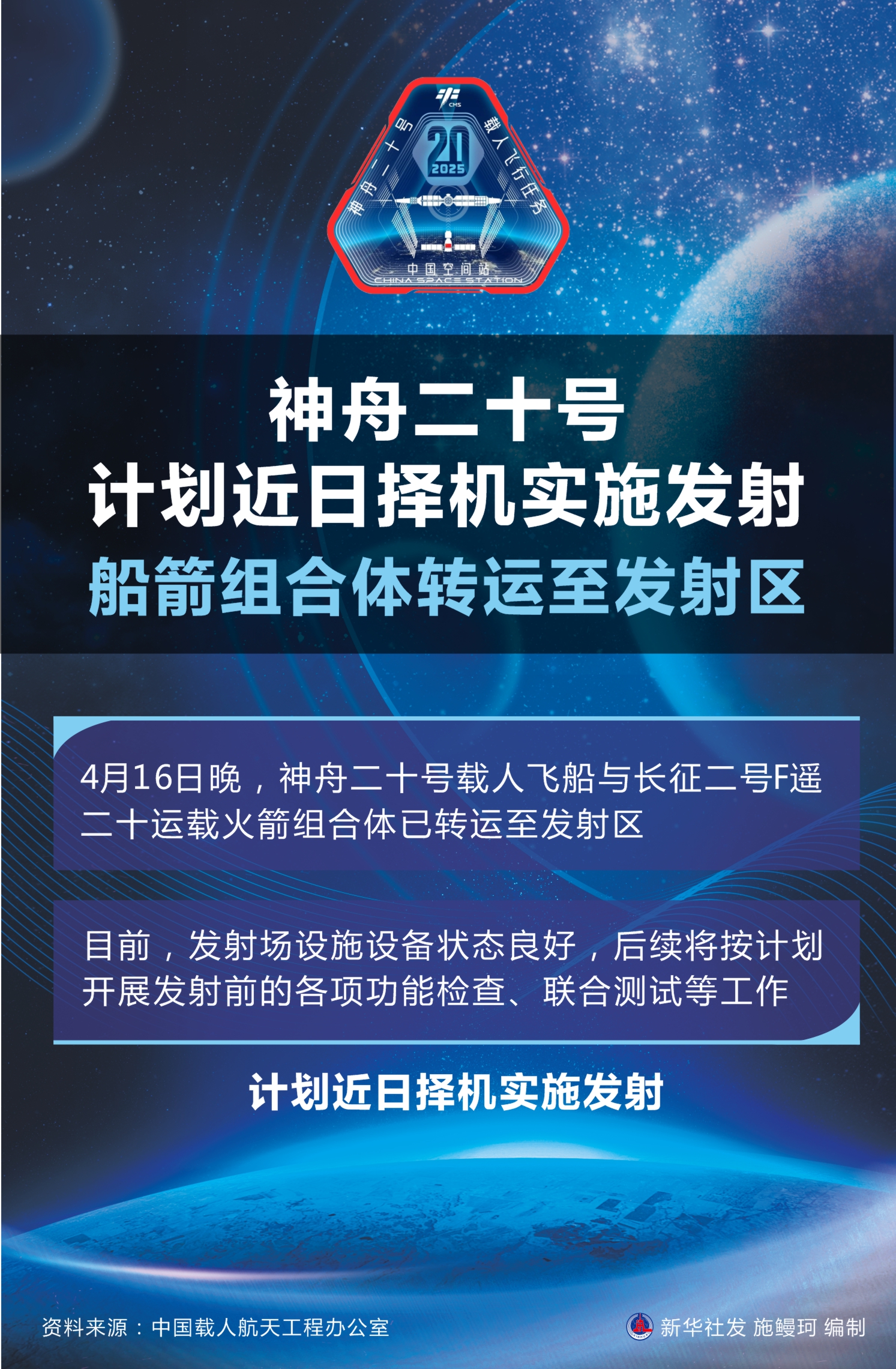 新华社酒泉4月16日电(李国利、邓孟)神舟二十号计划近日择机实施发射,船箭组合体16日已转运至发射区。