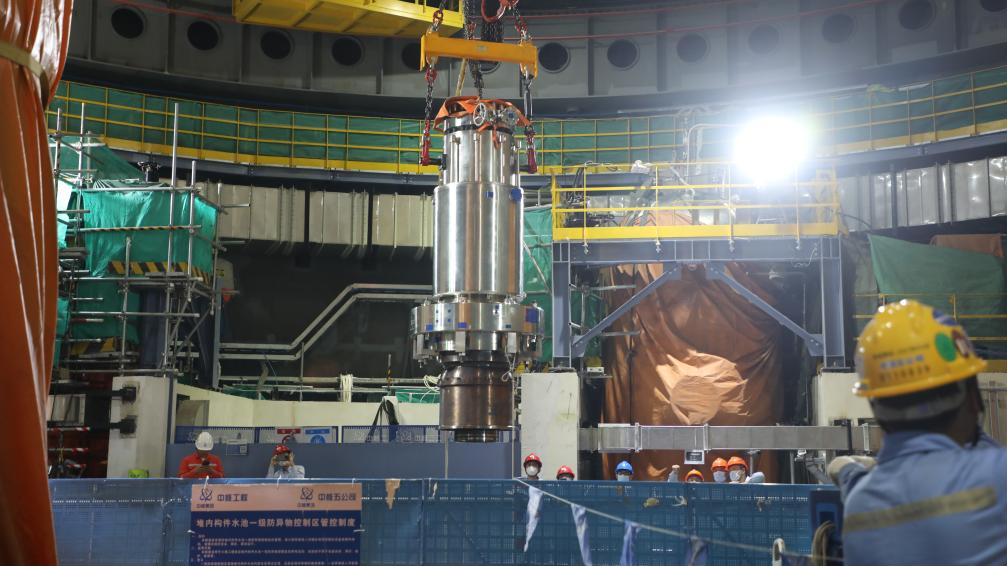 4月16日,“玲龙一号”全球首堆首台主泵正在吊装。(受访单位供图)