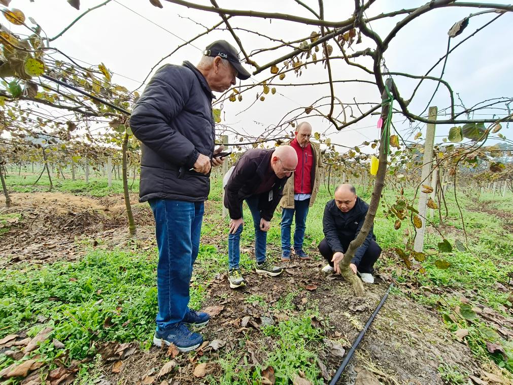 中国和新西兰双方专家在四川省德阳市一处猕猴桃试验田中查看植株生长情况(2023年12月15日摄)。新华社发