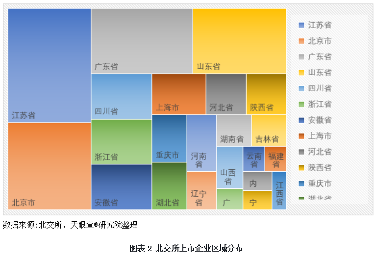 从区域分布来看,以江苏、北京、广东、山东为代表的制造业和科技创新省份,以涵盖53家上市企业占据北交所的半壁江山。其中,江苏囊括17家北交所公司位居榜首,北京、广东分别以13家、12家紧随其后,山东则以11家位列第四。