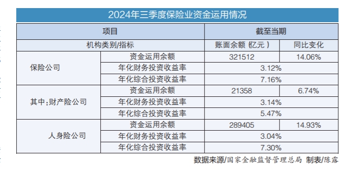 近日,国家金融监督管理总局披露2024年三季度保险业资金运用情况。数据显示,截至三季度末,保险业资金运用余额稳步增长,险资年化财务投资收益率和年化综合投资收益率同比均出现提升。