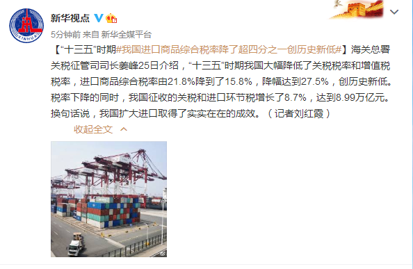 “十三五”时期我国进口商品综合税率降了超四分之一创历史新低