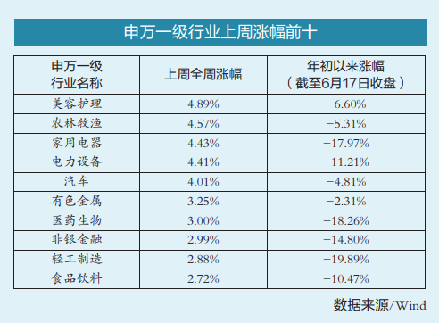 Wind数据显示,上周在31个申万一级行业板块中,美容护理板块以4.89%的涨幅位居第一,农林牧渔、家用电器两大板块分别以4.57%、4.43%的涨幅紧随其后——这三大板块均与消费有关。此外,汽车、食品饮料等消费类板块上周表现也较突出。