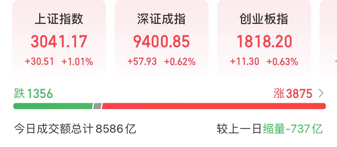 在油气、黄金、煤炭、铜等资源股带动下,A股继续反弹,截至收盘,上证指数上涨1.01%,深证成指上涨0.62%,创业板指上涨0.63%。