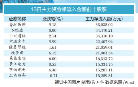 个股方面,鲁抗医药、N瑞迪、中兴通讯、中通客车、隆基绿能获得主力资金净流入金额居前,分别为3.80亿元、3.45亿元、3.43亿元、2.24亿元、2.11亿元。天孚通信、招商银行、世纪华通、昆仑万维、宁德时代主力资金净流出金额居前,分别净流出3.84亿元、3.20亿元、2.87亿元、2.74亿元、2.68亿元。