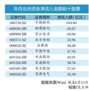 个股方面,今年以来,北向资金加仓宁德时代、招商银行、长江电力、北方华创、五粮液金额居前,分别达104.00亿元、60.87亿元、60.06亿元、53.96亿元、48.80亿元。