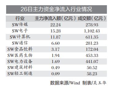 行业方面,26日申万一级行业中有9个行业出现主力资金净流入,其中传媒、电子、计算机行业净流入金额居前,分别为22.24亿元、15.28亿元、11.87亿元;在出现主力资金净流出的行业中,石油石化、汽车、公用事业行业净流出金额居前,分别为4.65亿元、4.51亿元、4.35亿元,出现主力资金净流出的行业板块净流出金额均较小。