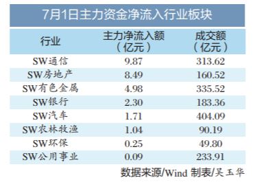 以7月1日为例,Wind数据显示,当日2208只股票出现主力资金净流入,通信、房地产、有色金属等八个行业出现主力资金净流入,其中上述三个行业7月1日分别净流入9.87亿元、8.49亿元、4.98亿元。