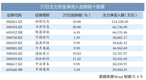 行业板块方面,21日申万一级行业中仅有国防军工、电力设备、有色金属、传媒4个行业出现主力资金净流入,净流入金额分别为16.97亿元、16.28亿元、8.08亿元、4.56亿元;在出现主力资金净流出的27个行业中,非银金融、电子、计算机行业主力资金净流出金额居前,分别净流出116.43亿元、74.54亿元、52.45亿元。个股方面,21日拓维信息、力源信息、隆基绿能主力资金净流入金额居前,分别为13.45亿元、6.67亿元、6.66亿元。东方财富、天风证券、海通证券主力资金净流出金额居前,分别为41.63亿元、17.90亿元、14.61亿元,主力资金显著流出券商股。