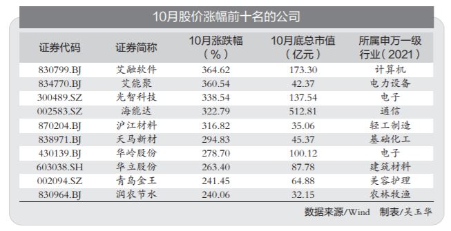 10月申万一级31个行业中,电子、计算机、综合行业涨幅居前,分别上涨14.65%、14.46%、10.72%,国防军工行业也涨逾10%。10月A股共有3347只股票涨幅为正,239只股票涨幅在50%以上,60只股票涨幅超过100%。剔除10月上市的新股,有5只股票涨幅超过300%,艾融软件、艾能聚10月累计涨幅均超过360%。