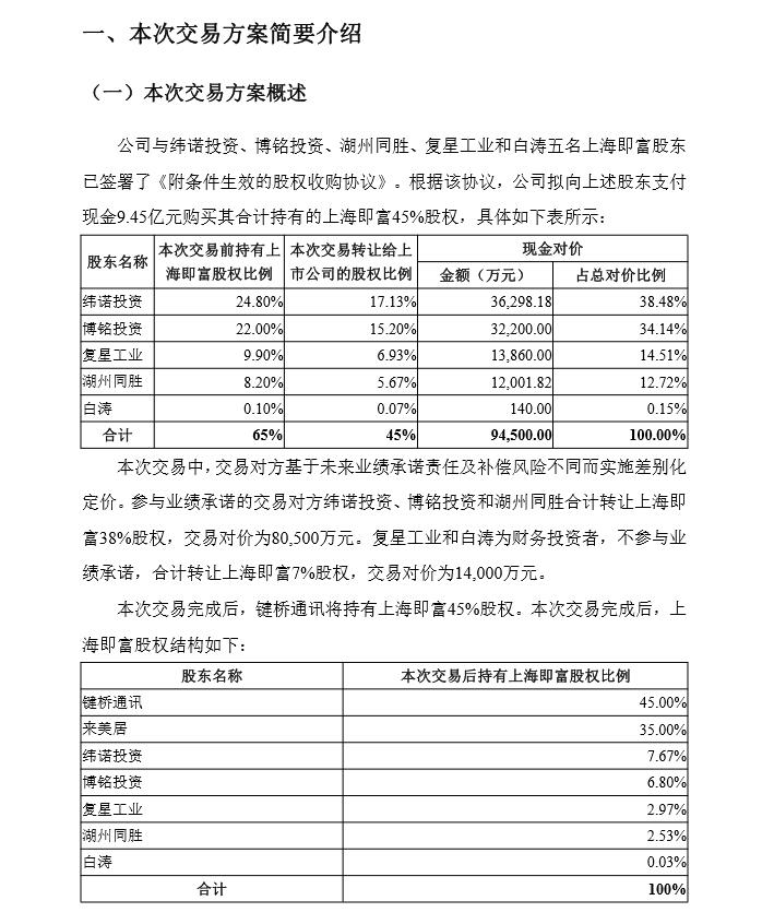 2016年10月17日,键桥通讯与纬诺投资、博铭投资、复星工业、湖州同胜、白涛、黄喜胜和王雁铭签署了《附条件生效的股权收购协议》,公司拟向上述股东支付现金9.45亿元购买其合计持有的上海即富45%股权,根据《重组管理办法》的规定,本次交易构成重大资产重组。交易完成后,公司将成为上海即富的第一大股东,根据《附条件生效的股权收购协议》,届时上海即富将设7名董事席位,公司有权按照法定程序向上海即富推荐4名董事候选人,上海即富的董事长及法定代表人由公司推荐人员担任,上海即富将纳入公司合并报表范围。