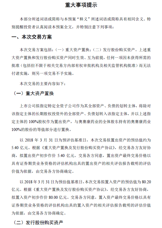 本次交易中,拟置出资产的初步作价为5.40亿元,拟购买资产的初步作价为80.00亿元,上述差额74.60亿元由上市公司以发行股份的方式向奥赛康药业的全体股东购买。