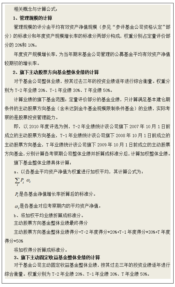 计算纳入考察范围的参评公司旗下各标准股票型基金、积极灵活型基金和积极配置型基金整体规模及规模增长,具体算法参见金牛基金管理公司规模评价部分。