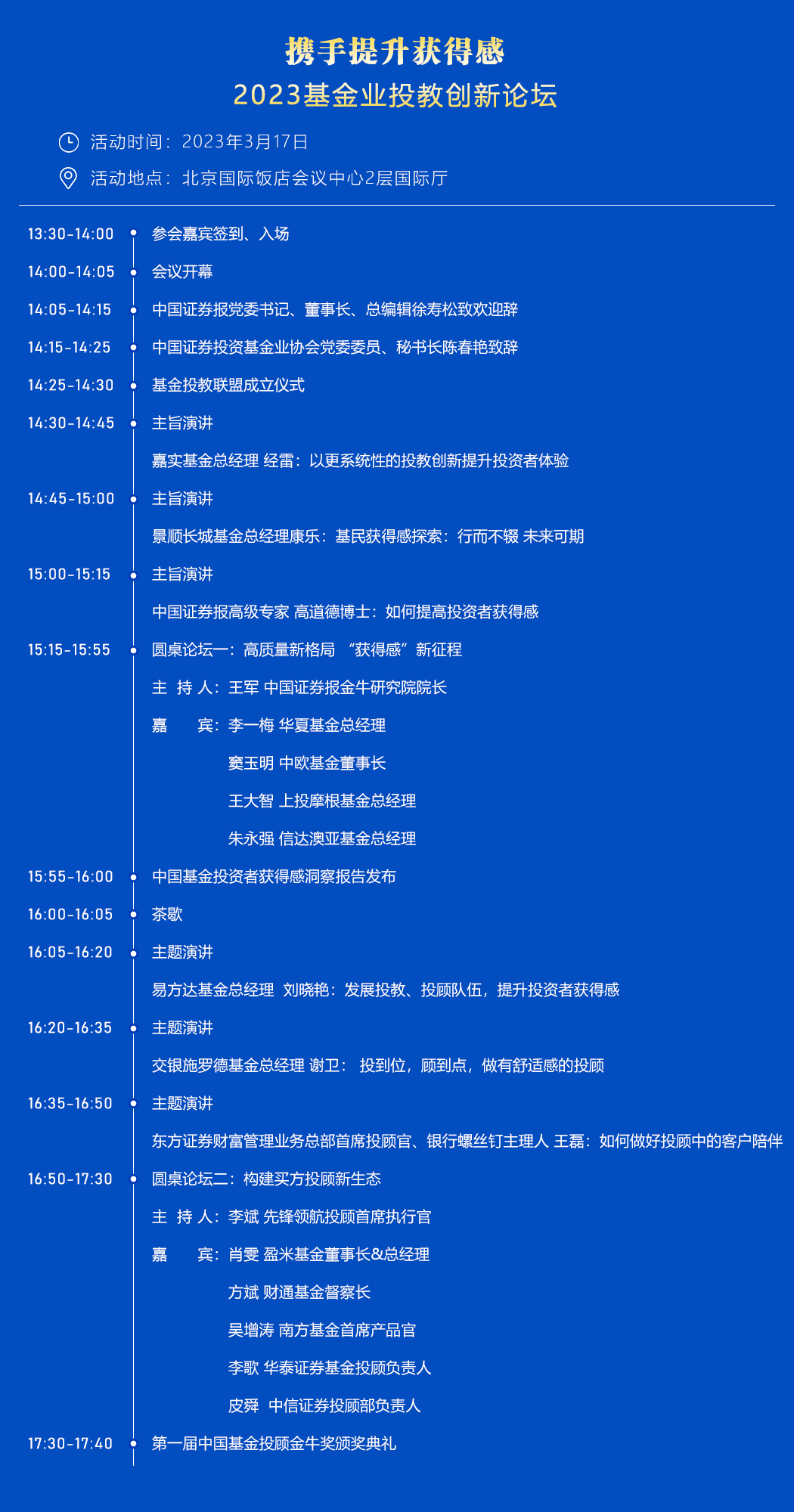 新时代绘织新蓝图,新征程吹响新号角。值此中国证券报三十而立之际,由中国证券报社主办的“2023基金业投教创新论坛”于2023年3月17日在北京隆重举行,纵论新发展格局下基金行业的使命与机遇,共话高质量发展蓝图中投资者获得感的提升。与该论坛同时举办的还有基金投教联盟成立仪式、中国基金投资者获得感洞察报告发行仪式、第一届基金投顾金牛奖颁奖典礼,盛况空前。