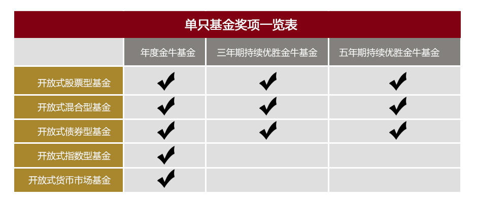 单只基金评选依据《基金业金牛奖基金分类体系》一级分类并考虑封闭式基金、指数基金的特殊情况,按封闭式、开放式股票型、开放式混合型、开放式指数型、开放式债券型、开放式货币市场基金六大类型分类实施。