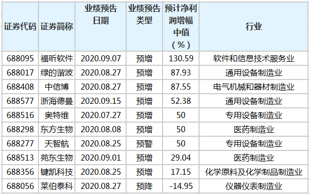 证券时报 数据宝统计显示,截至9月16日,有45家科创板公司公布了前三季业绩预告。业绩预告类型显示,预增公司10家;业绩预降公司8家、预亏公司有7家。以预计净利润增幅中值统计,有1家公司净利润增幅超100%;净利润增幅在50%~100%之间的有5家。