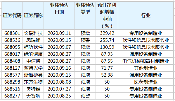 具体到个股看,奕瑞科技预计净利润增幅最高。公司预计前三季净利润增幅中值为329.42%;福昕软件、绿的谐波预计净利润同比增幅中值分别为130.59%、87.93%,增幅位列第二、第三。