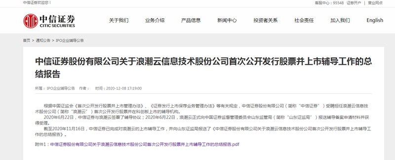 据中信证券官网12月9日消息,截至2020年11月16日,中信证券已完成对浪潮云的科创板上市辅导工作,并向山东证监局报送了《中信证券股份有限公司关于浪潮云信息技术股份公司首次公开发行股票并上市辅导工作的总结报告》。