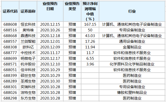 具体到个股看,恒玄科技预计净利润增幅最高。公司预计2020年净利润增幅中值为167.15%;奥特维、鼎通科技预计净利润同比增幅中值分别为50%、43.03%,增幅位列第二、第三。