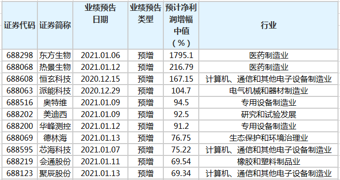 具体到个股看,东方生物预计净利润增幅最高。公司预计2020年净利润增幅中值为1795.10%;热景生物、恒玄科技预计净利润同比增幅中值分别为216.79%、167.15%,增幅位列第二、第三。