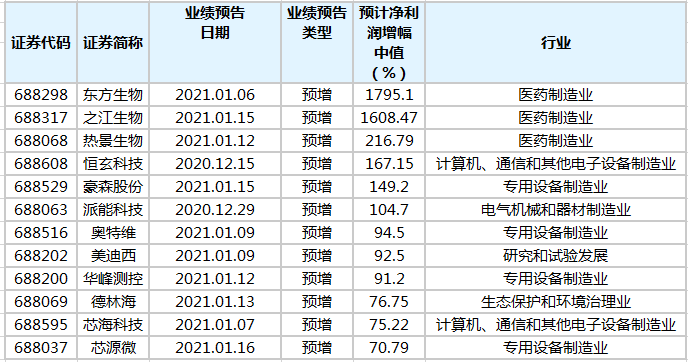 首页>科创板 60家科创板公司预告2020年业绩 6家净利润增幅翻倍 证券时报网2021-01-18 10:38 证券时报?数据宝统计显示,截至1月18日,有60家科创板公司公布了2020年业绩预告。业绩预告类型显示,预增公司34家;业绩预降公司5家、预亏公司有13家。以预计净利润增幅中值统计,共有6家公司净利润增幅超100%;净利润增幅在50%~100%之间的有11家。 具体到个股看,东方生物预计净利润增幅最高。公司预计2020年净利润增幅中值为1795.10%;之江生物、热景生物预计净利润同比增幅中值分别为1608.47%、216.79%,增幅位列第二、第三。