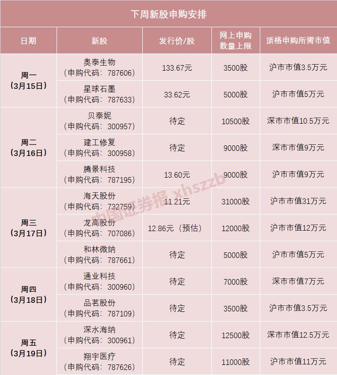 根据新股发行安排,本周(3月15日至3月19日)A股将有12只新股申购,包括沪市主板2只、科创板6只、创业板4只。这12只新股累计发行数量共计约4.17亿股,预计募集资金金额共计77.89亿元。