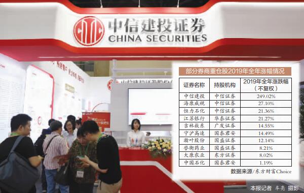 2019年全年上证综指涨22.3%、沪深300指数涨36.1%、创业板指涨43.8%,中证全债(净价)指数涨0.74%。Choice数据显示,根据2019年三季报披露的数据,共计有47家券商重仓了233只A股股票,持仓总市值为347.30亿元。从单个券商对单只个股的持仓市值来看,截至2019年三季度末,中信证券持有的中信建投市值为85.60亿元,排名居首;华泰证券持有的江苏银行市值为42.94亿元,排名第二;中信证券持有的海康威视的市值为31.30亿元,排名第三;中信证券持有的恒力石化的市值为11.98亿元,排名第四;广发证券持有的吉林敖东的市值为6.69亿元,排名第五。