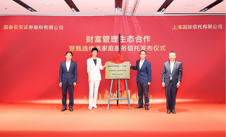 国泰君安党委委员、副总裁李俊杰、上海国际信托党委书记、总经理陈兵出席仪式并致辞。国泰君安金融产品部总经理李可柯与上海国际信托副总经理叶力俭代表双方为“甄选传承家庭服务信托”业务揭牌。双方相关部门、业务试点分公司负责人出席仪式。