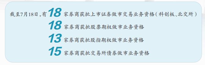 据中国证券报记者不完全统计,截至7月18日,有18家券商获批上市证券做市交易业务资格(科创板、北交所)、18家券商获批股票期权做市业务资格、13家券商获批股指期权做市业务资格、15家券商获批交易所债券做市业务资格。
