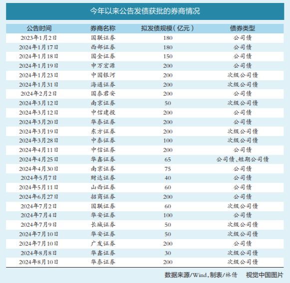 作为中小券商的国联证券、西部证券今年每次获批的拟发债规模均不超过180亿元;国金证券、中泰证券、华安证券、华鑫证券、长城证券、南京证券今年每次获批的拟发债规模均不超过100亿元。