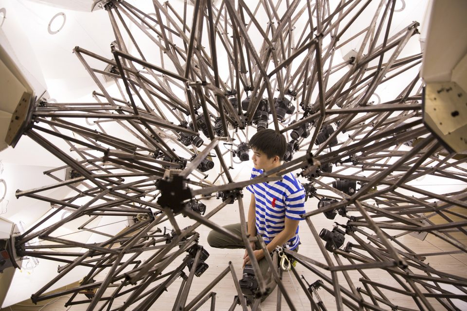 3D扫描舱是一个用于三维扫描的摄影棚。它的与众不同之处在于,可以即时完成对大小规格不等物体的数字化三维扫描。拍摄物被置于一个由一百多台定焦单反相机构成的球面阵当中,该结构受到霍伯曼球(hoberman sphere)的启发,每个节点上都有一台相机,可实现等速运动。