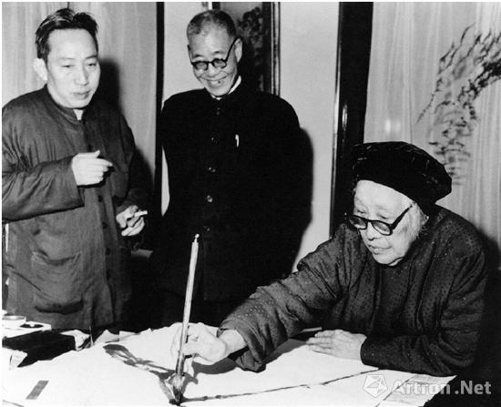 除了写生,与当时在杭的文艺界名流交游也是傅抱石客杭期间非常重要的日常活动。当时他居住的南山招待所,经常与同住在招待所的时任中国美协主席何香凝、浙江美术学院院长潘天寿见面。三人在一起谈艺论道,兴之所致则合作作画,留下许多佳作,一时成为美谈。这些合作多在1963年元旦前夕完成,适逢节庆,多选择应景之物如梅竹双清一类,唯独一件傅抱石与何香凝合作的《赏雪图》十分特别,傅抱石所绘仕女衣着猩红色斗篷,立于一片白雪之中,画面上部何香凝所绘几束垂柳将留白破开,气韵高昂,别出心裁。