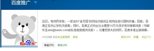 9月12日消息,记者从百度官方微博了解到,近日,有网民举报,一家名叫“谜月团”的网站伪装成正规网站进行团购诈骗。目前,百度正在向公安机关报案。同时,百度正式向全社会最高悬赏10万元寻求有效破案线索。对遭受损失的网民,百度承诺依据今年早些时候推出的“网民权益保障计划”进行全额保障。