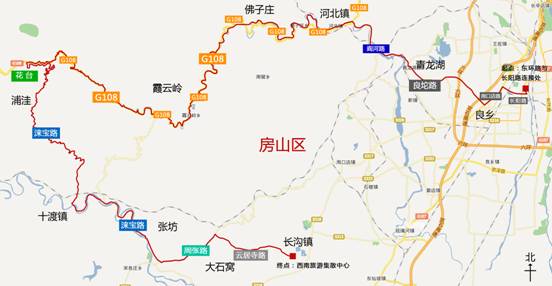 本次骑行活动主要沿108国道房山区路段展开,全程210公里,将以奥特莱斯为起点,途径青龙湖镇,河北镇,佛子庄,霞云岭,蒲洼,十渡,张坊,终点至首都西南旅游集散中心。北京108国道房山路段贯穿房山绝大多数精华景观,其路况条件也最为优越,尤其是210公路段盘山公路最受发烧友们期待。一路沿盘山公路爬升,极大的增加了骑行的难度和乐趣。行至蒲洼黑山剁附近时,最高海拔将达到1632.17米,在此俯瞰村庄、眺望远山,万山红遍、层林尽染,山区秀丽风光尽收眼底。在此感受驾驭的乐趣,体会自由和飞驰将成为独一无二的享受。