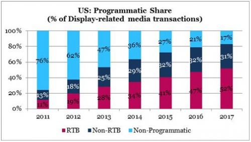 程序化购买(Programmatic Buying)的革命已经在美国打响。根据MAGNA GLOBAL最新的调研显示,在2013年通过程序化购买的广告花费将会达到74亿美元,占所有展示广告的53%;而74亿美元里,通过实时竞价(RTB或Real-time Bidding)交易的金额占39亿美元(53%),非实时竞价(Non-RTB)的金额达到35亿美元(47%)。MAGNA GLOBAL并预计,通过程序化购买交易的金额,在2017年将会达到169亿美元,占所有展示广告的83%。