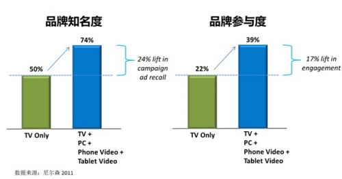 根据美国尼尔森的调研显示,在同样的预算前提下,如果把所有钱投放在电视广告,跟把部分预算挪到PC、移动视频、平板视频来做比较,后者的品牌知名度能提升24%;而品牌参与度则能提升17%。