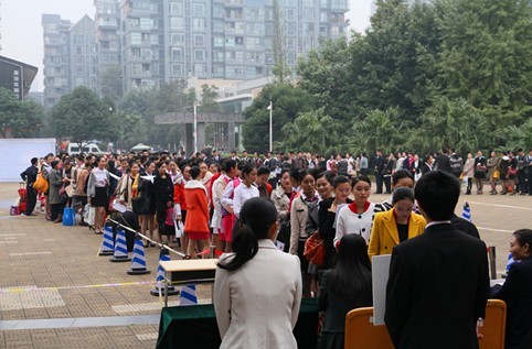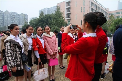 一大清早,成都职业技术学院教学楼下就排起了长龙,众多应试者们不顾立冬以来的凉凉秋意,在现场工作人员的引导下,按照招聘现场流程,依次进行相应岗位的应聘工作。趁排队等候的时间,有的姑娘赶紧拿出镜子补一补妆,有的则干脆拿出手机,拍照留念。一位空乘专业的大二学生告诉工作人员:“以前去杭州西湖旅游过,风景太漂亮了,能去杭州工作,又是我自己喜欢的空乘岗位,这个机会很难得。”