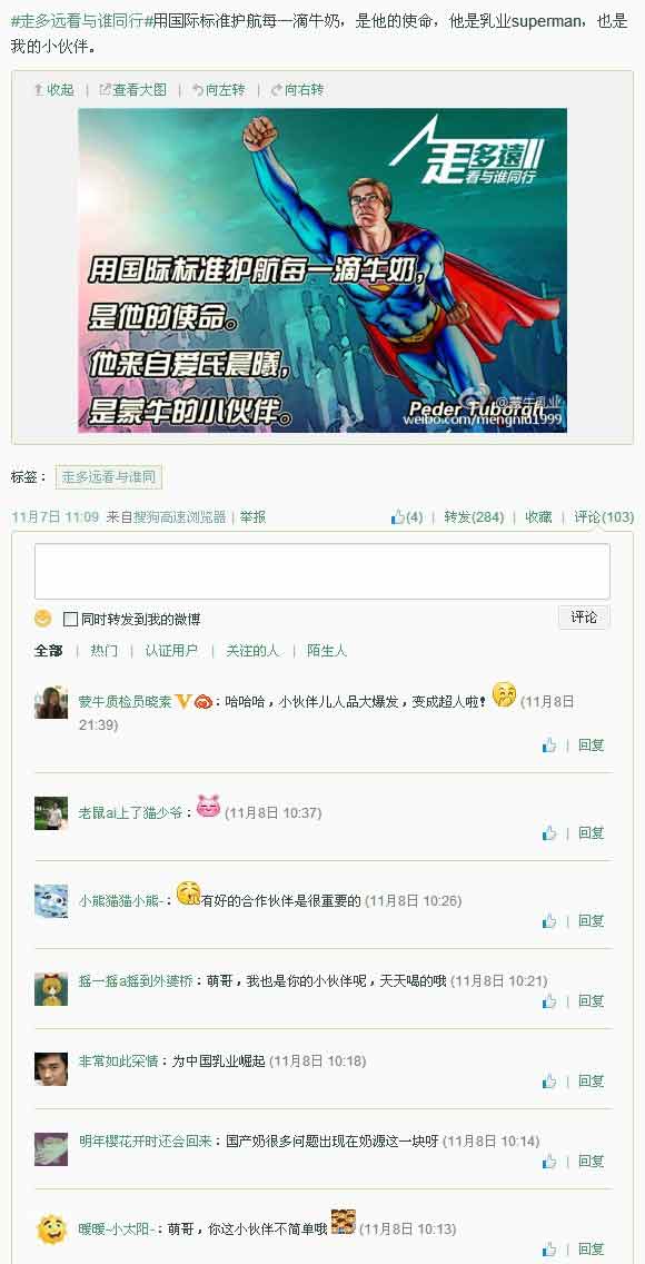 而蒙牛乳业还以#走多远看与谁同行#为话题,让大家深深地感受到对8位战略级国际合作伙伴多年以来“相濡以沫”的感恩。很多人看完之后开心地一笑,更有网友对其“点32个赞”。笔者在新浪微博搜索中发现,蒙牛乳业超级英雄的相关微博,已被广告门、营销智库、国际4A广告网等行业媒体、以及众多微博红人,作为品牌与消费者的沟通案例进行转发分享,系列微博的总覆盖人数已超过百万。
