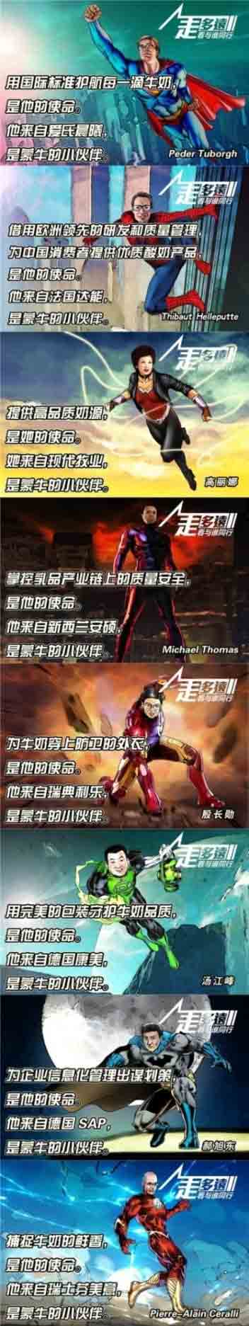 在双11期间,蒙牛和他的小伙伴就给了我们一个不小的惊喜,当然,他们不是参与硝烟四起的价格战,而是在蒙牛乳业官方微博和官方微信大Show“二次元情书”。出乎意料的是,蒙牛乳业8位合作伙伴的总裁或CEO,被创意变身为美国漫画中的超级英雄,包括丹麦乳业巨头爱氏晨曦、法国达能、瑞典利乐、现代牧业在内的企业CEO,都纷纷表示自己是蒙牛的小伙伴。