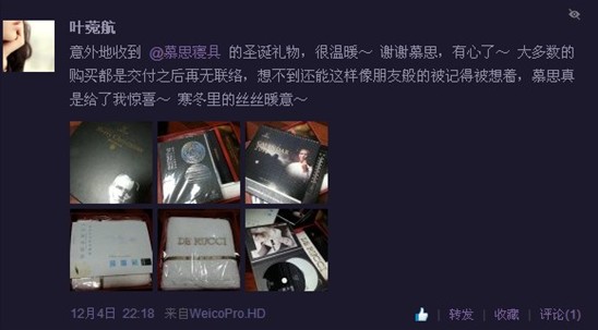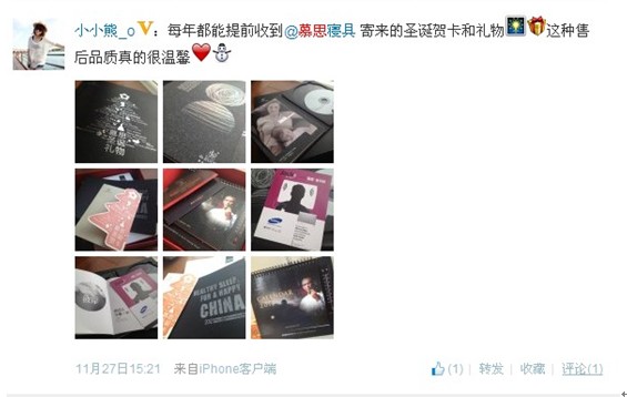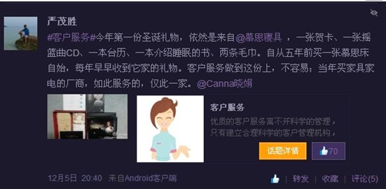 来自北京的一个名为严茂胜的普通用户发微博感叹:“今年第一份圣诞礼物,依然来自慕思寝具。自从五年前买了一张慕思床后,每年早早收到它家的礼物,客户服务做到这份上,不容易;当年买家具家电的厂商,如此服务的,尽此一家。”