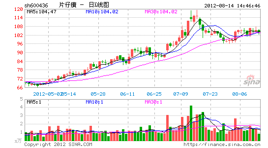 2012年8月13日,片仔癀收涨0.33%,报105.16元。