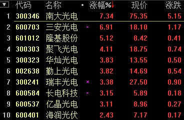 半导体照明板块盘中震荡上扬,截至10:08,南大光电行逾7%,三安光电涨近7%,隆基股份涨逾5%,聚飞光电涨逾4%,华灿光电、勤上光电等涨幅超过3%。