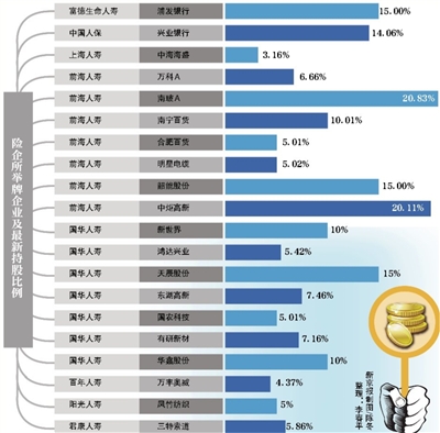 “财大气粗”的并非富德生命人寿一家。自七月上旬股灾之后,包括前海人寿、国华人寿、中国人保、阳光人寿、上海人寿、君康人寿、富德生命人寿和百年人寿在内的8家险企已经成功举牌20家上市公司。
