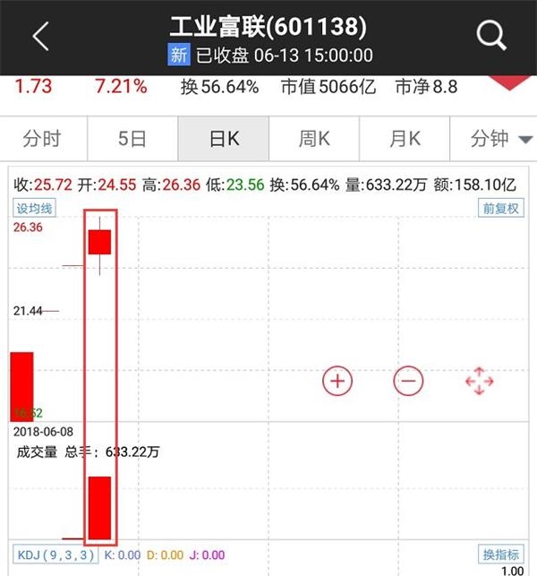 上周五刚在A股上市的富士康(股票简称:工业富联,股票代码:601138),在连续三个一字涨停板后,终于打开涨停,并放出巨量,13日全天合计成交158.1亿元,换手率高达56.64%。值得注意的是,沪市13日成交1559.35亿元,这意味着富士康13日成交额已超过沪市1/10。