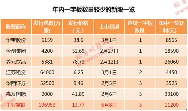 数据显示,年内新股连续一字板数量低于3个的仅有华宝股份、今创集团、养元饮品、江苏租赁等4只新股。除富士康外,连续一字板数量为3个的新股也仅有华西证券、嘉友国际两只。
