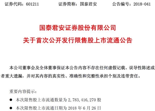 国泰君安今日晚间公告显示,该公司有27.83亿股限售股将在6月26日解禁,占公司总股本的31.94%。